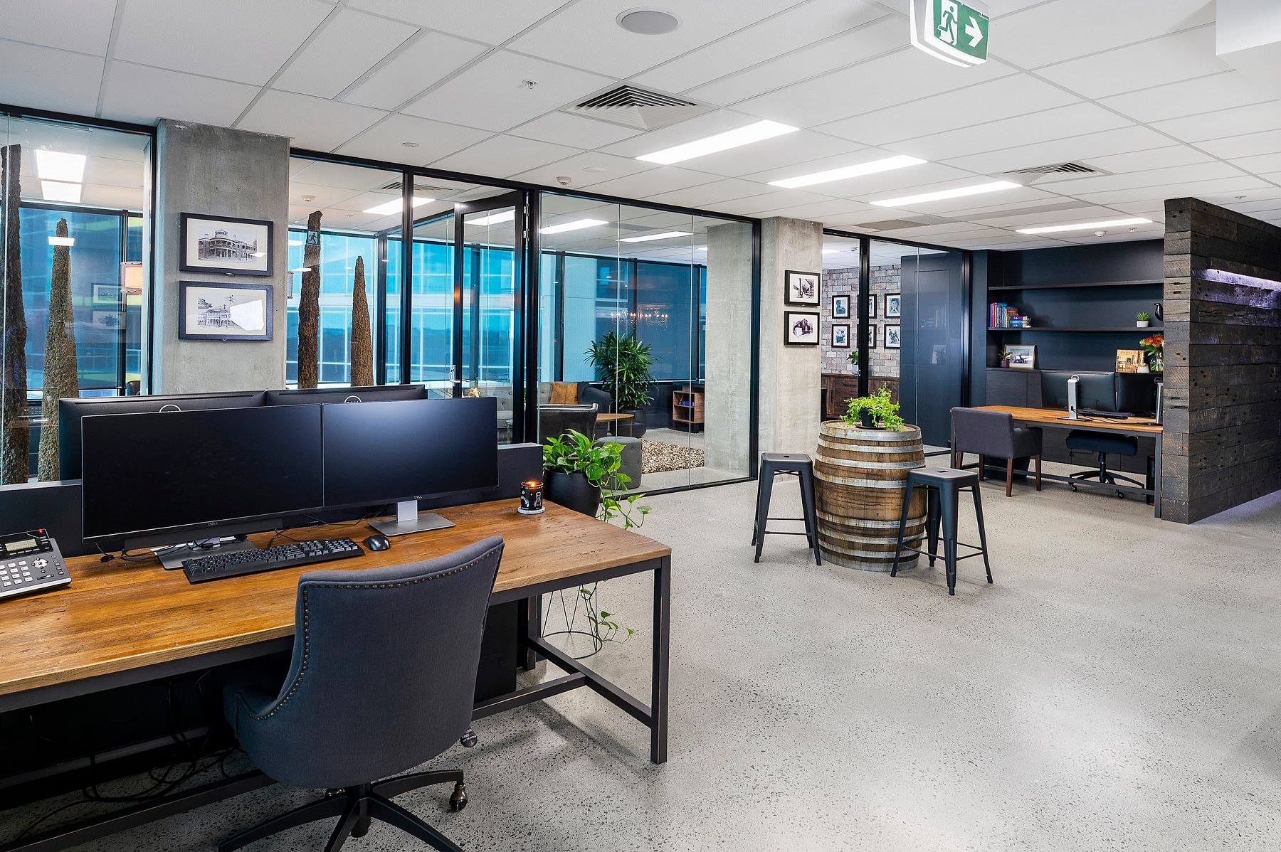 The space is a perfect blend of ‘Farmhouse Chic’ design elements and décor that bring warmth to the place. From its stylish polished concrete flooring to 200-year-old Chinese doors turned into office desks, the space is filled with visually appealing elements. The beautifully cushioned bench seating with storage underneath, sanded structural concrete support columns, and foundry walls and accents throughout, all add to the comfort and functionality of the space.