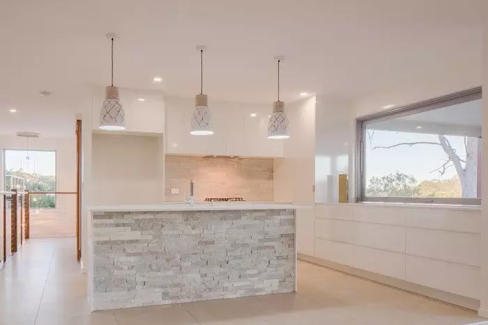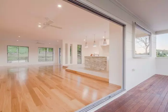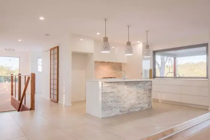 Open tread timber stairs lead up to a large living area with adjoining dining & kitchen. A large deck invites the owners to make the most of their hilltop position & views. In addition to the open plan & feature void, there are four oversized rooms, a study and a generous master suite – complete with private deck & freestanding bath.